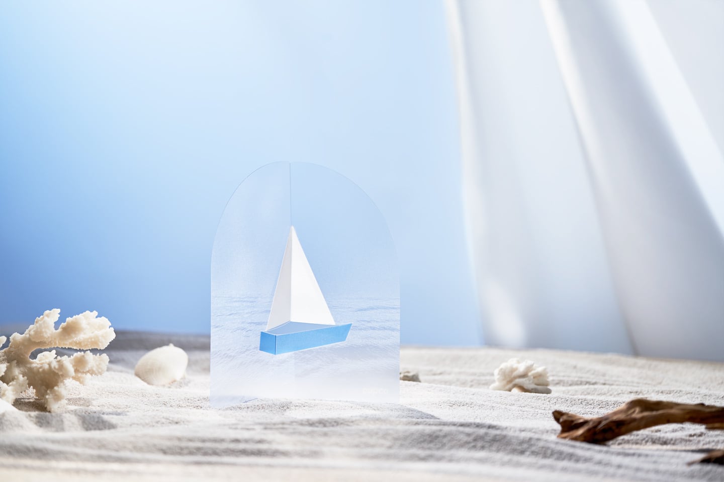 波の輝きや風を受けた帆の質感は、シルクスクリーン印刷で立体感を付けることで再現しました。さらに、背景にはデジタル印刷で色を付けることで、淡いグラデーション表現を可能にしています。