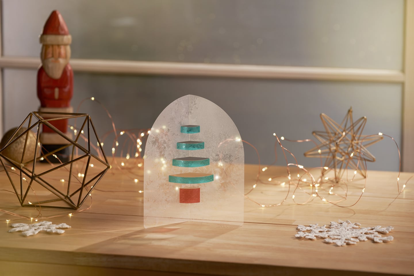 デジタル印刷によって背景に霜が降りたような微細さを、シルクスクリーン印刷によってツリーの手触りとキラキラ感を表現しました。